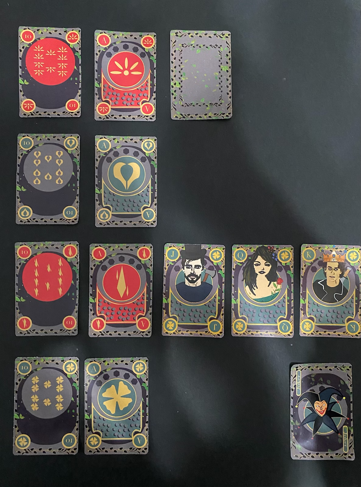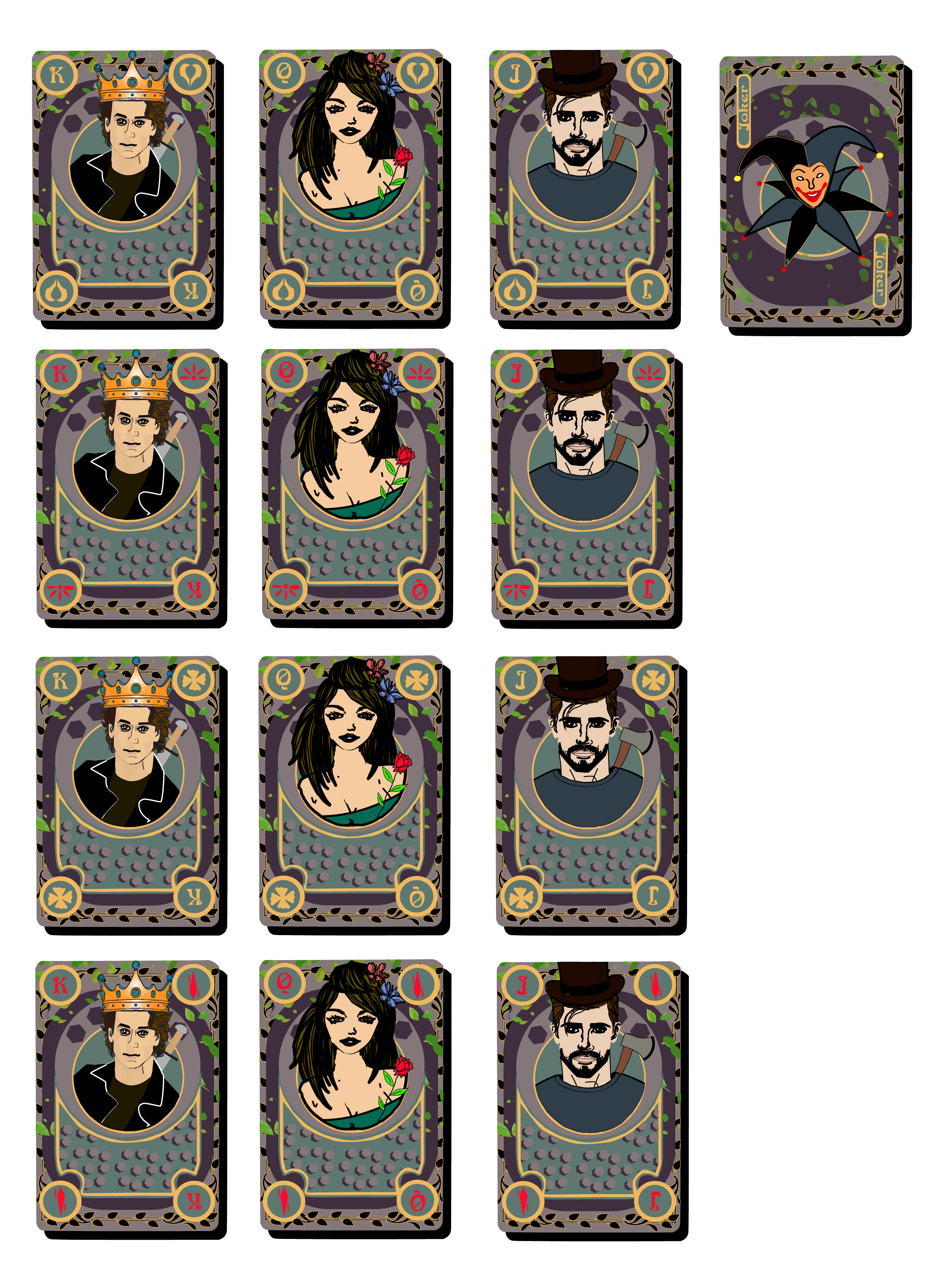 Division of work: For this cards, I was tasked with making the portrait illustrations while my design partner Emmanuel created the intricately designed cards themselves and choose the typeface we used to indicated the numbers for them.