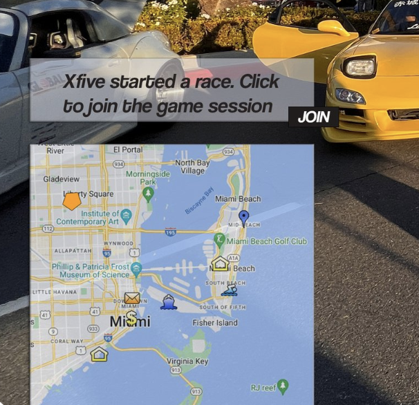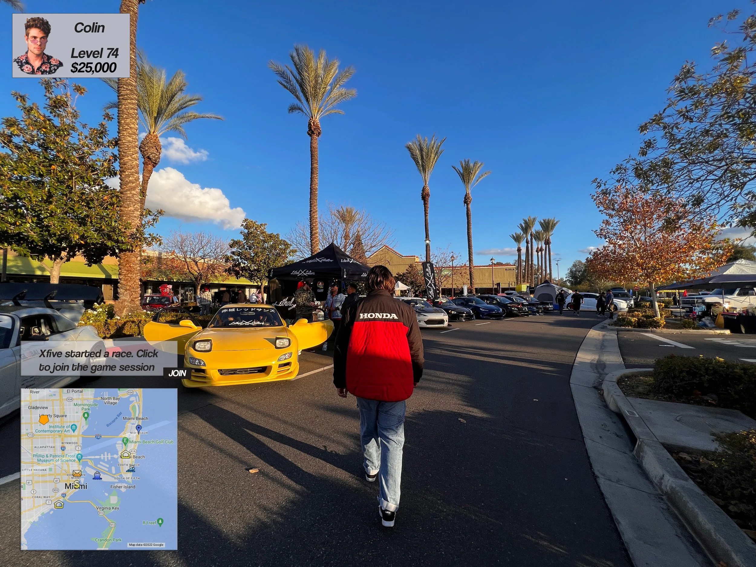 You can also play in first-person driving mode. This is what it looks like. The player is looking for a race to join around Miami.