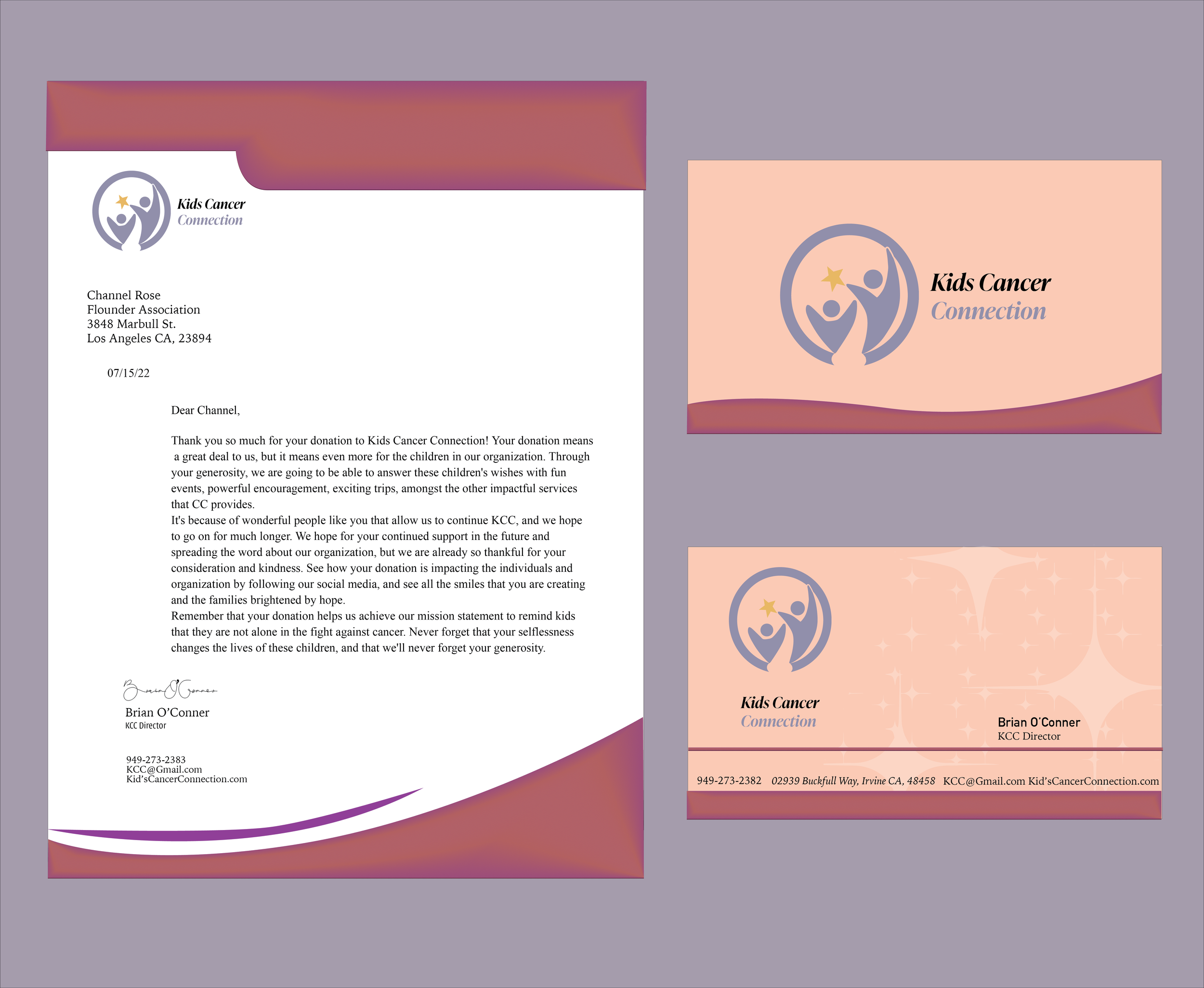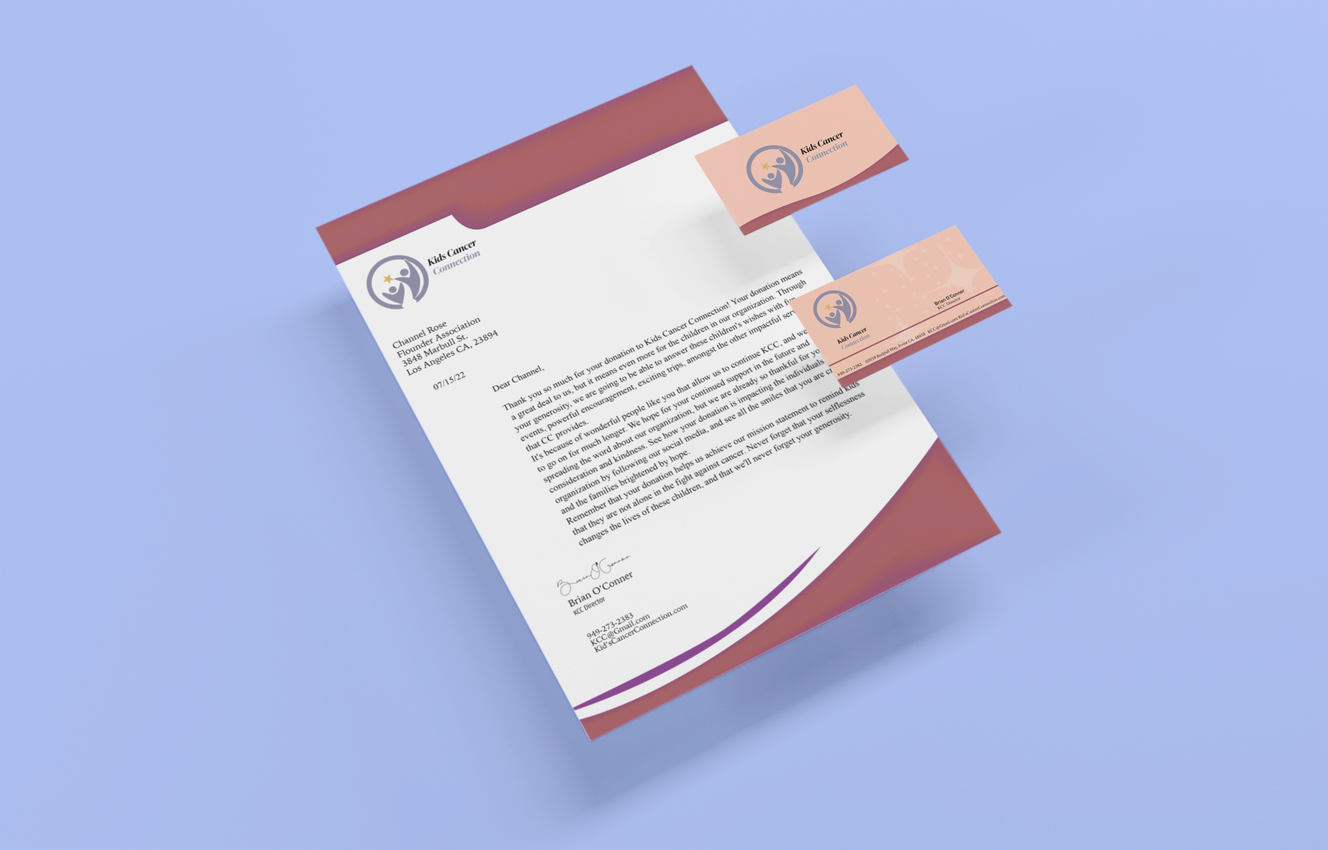 A letterhead and business card were created to serve as tools for connecting with and strengthening relationships within the Kids Cancer Connection community. They can be used to provide important information that families may need or wish to know. Anyone have questions, all essential contact information can be found on both designs.